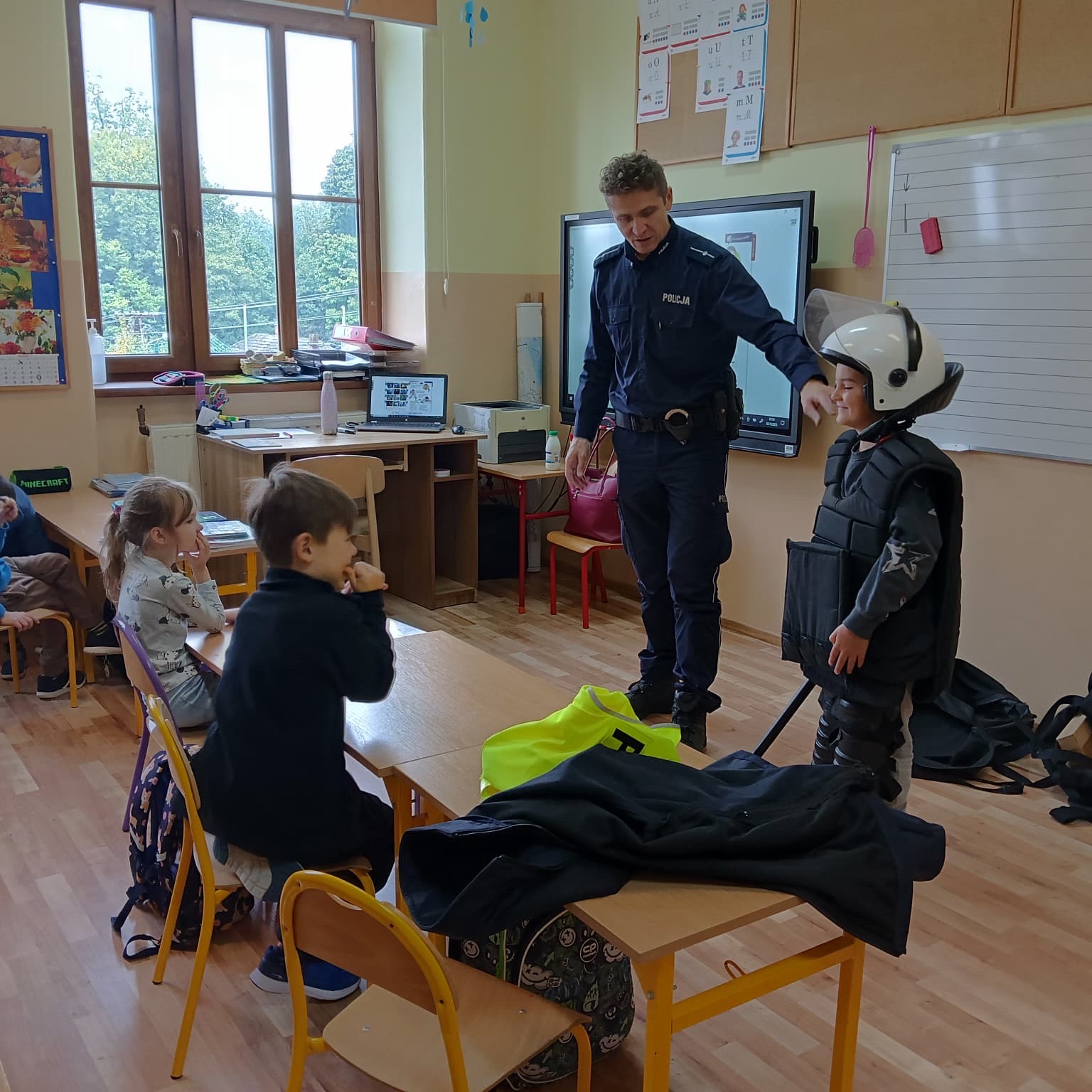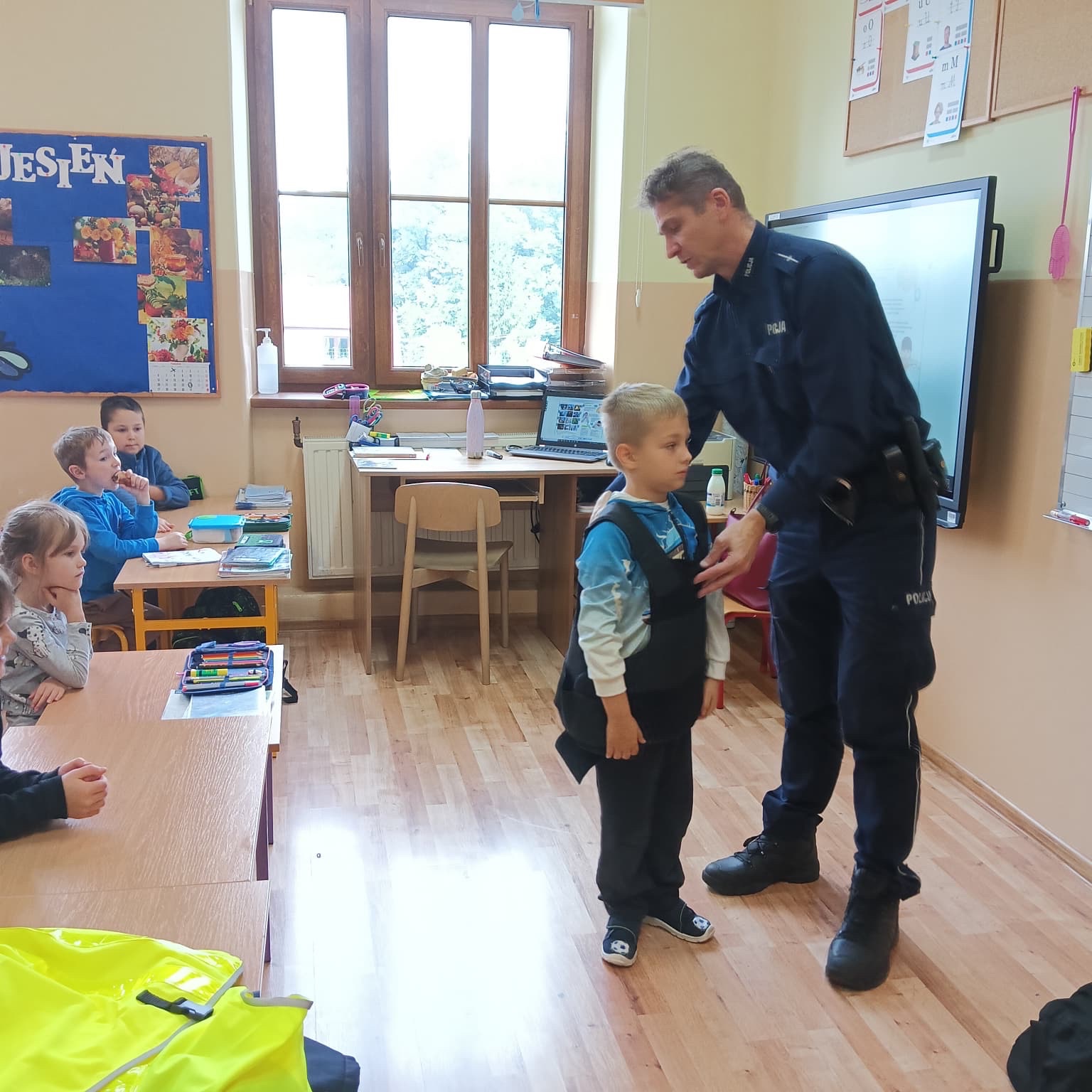 Dzieci miały również okazję obejrzeć sprzęt, jakiego policjant używa w swojej pracy, a kilku ochotników mogło przymierzyć niektóre elementy policyjnego umundurowania. Na koniec spotkania każdemu pierwszoklasiście policjant wręczył opaskę odblaskową.