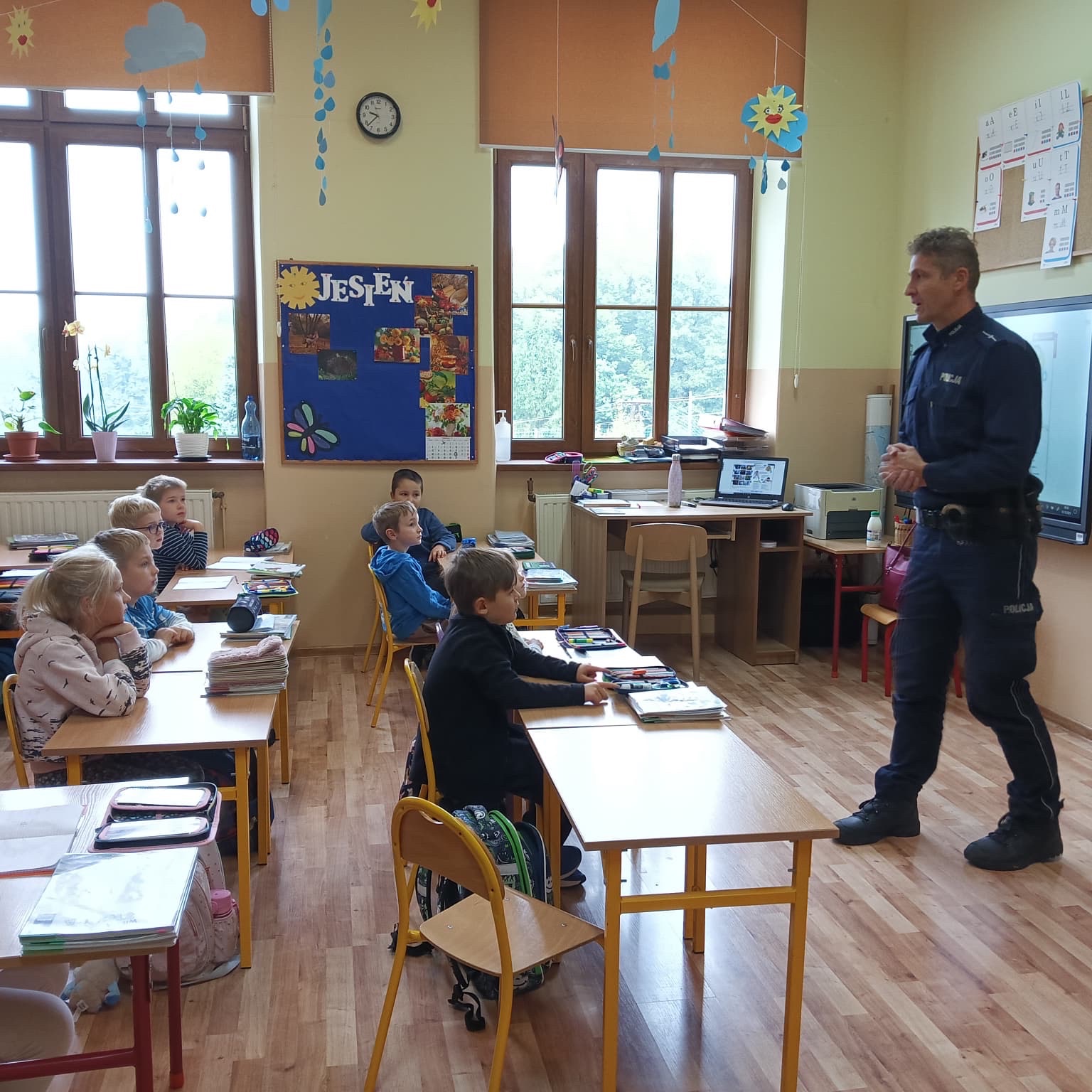 2 października odbyło się spotkanie uczniów klasy I z policjantem – mł.asp. Mikołajem Kalfasem, dzielnicowym Grodźca. Policjant rozmawiał z dziećmi o podstawowych zasadach ruchu drogowego, podkreślając ważną rolę elementów odblaskowych. Przypomniał zasady, których należy przestrzegać w kontaktach z obcymi.