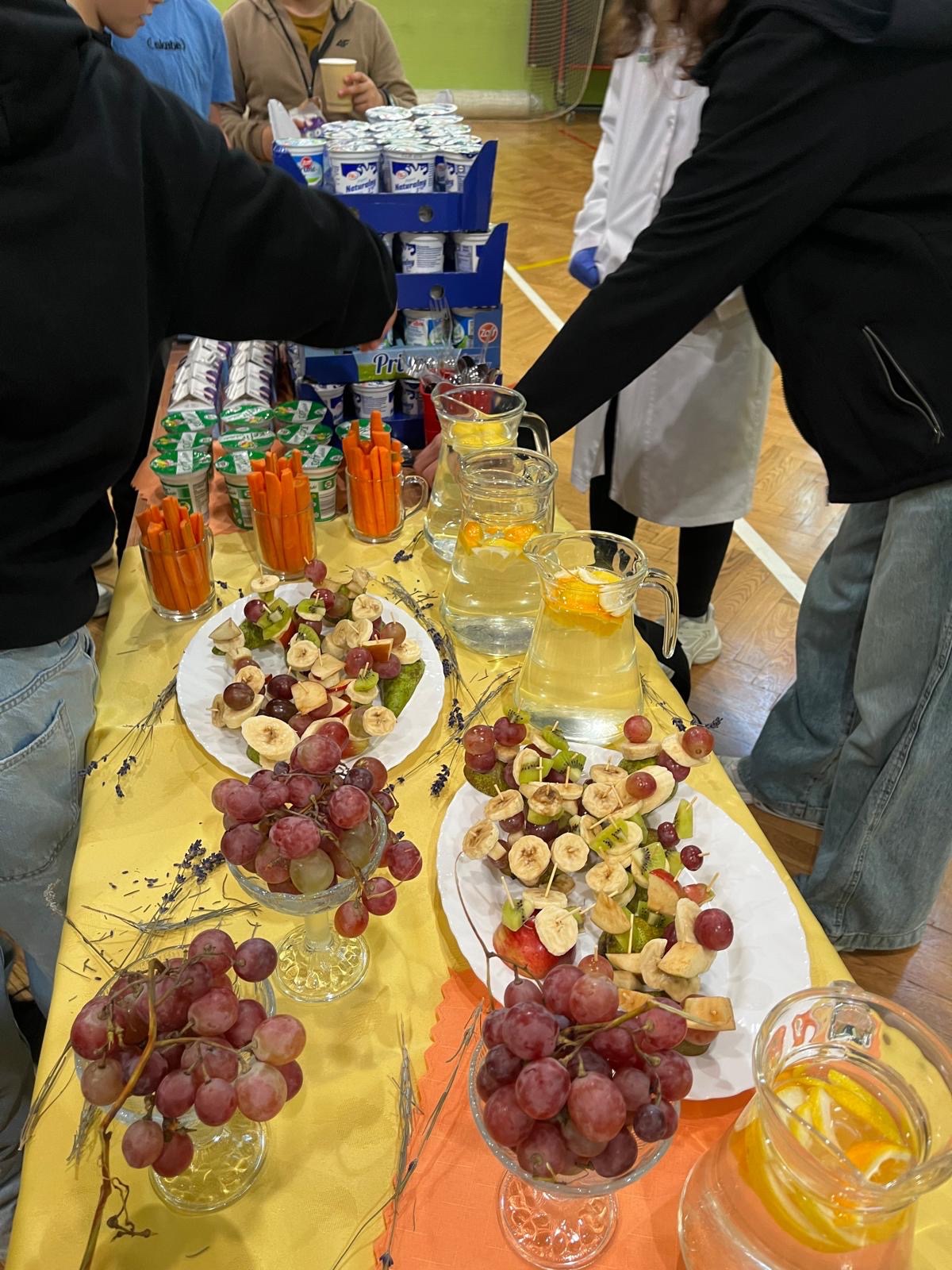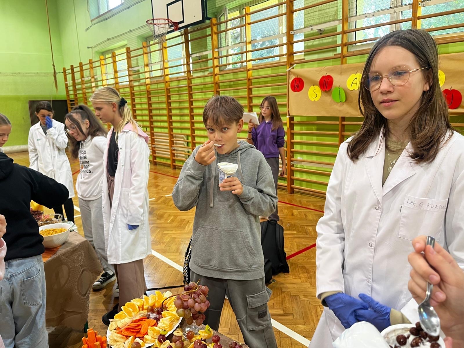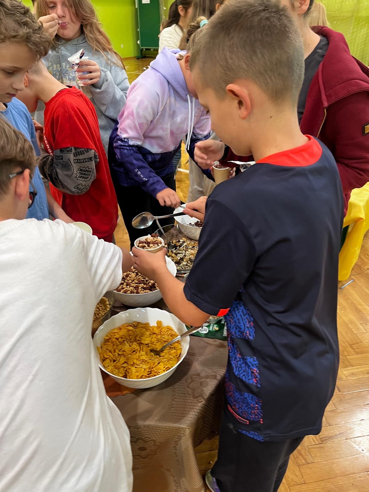 Dzisiaj uczniowie z klasy 6, w ramach podsumowania jednego z działów edukacji zdrowotnej dotyczącego właściwego odżywiania, przygotowali pyszne przekąski. Na stole królowały świeże warzywa, owoce, jogurty, mleko, kefir oraz rożnego rodzaju musli. Uczniowie z klas 4-8 samodzielnie komponowali swoje drugie śniadanie! Było zdrowo, smacznie i kolorowo!