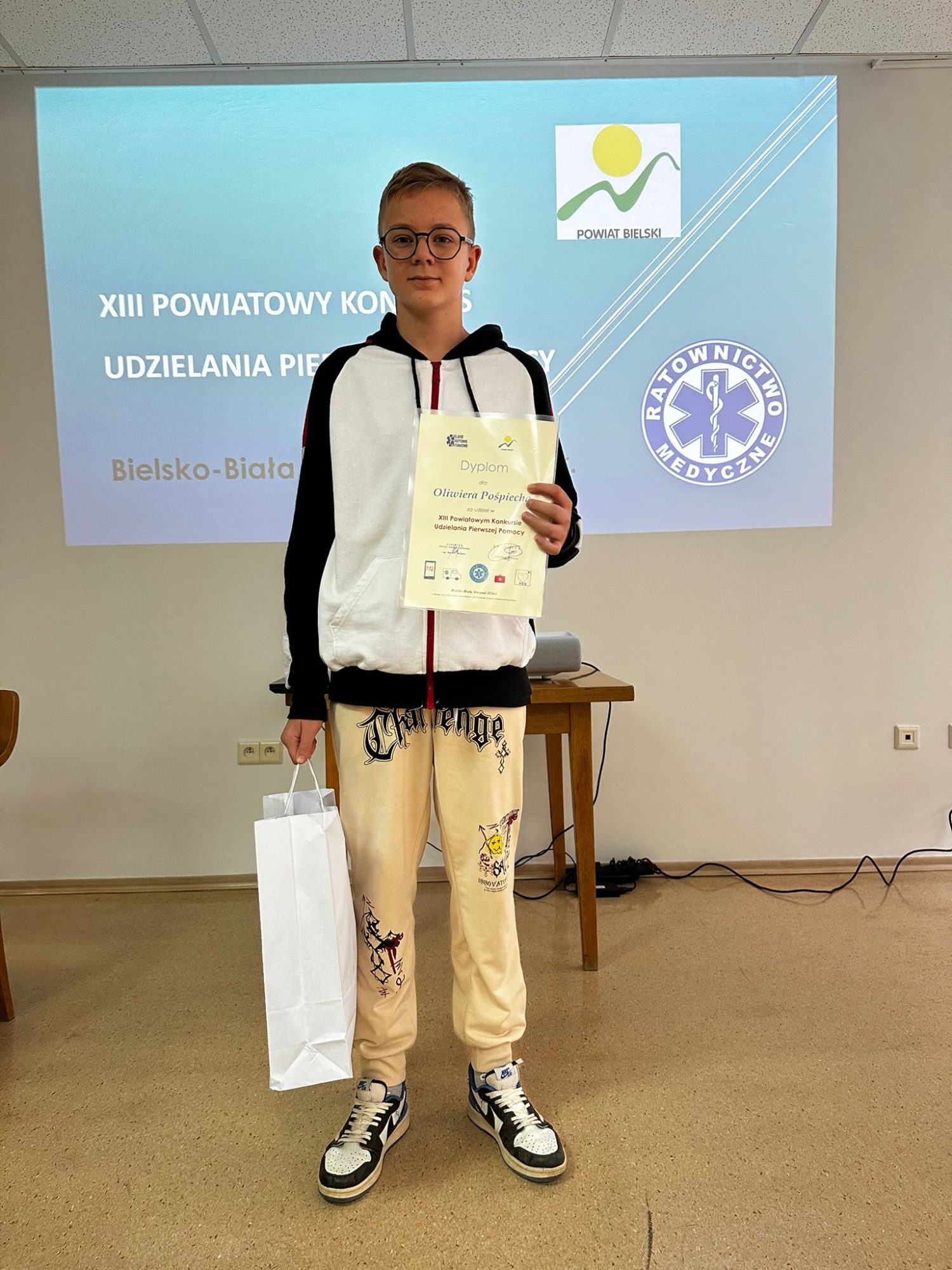 13.11.2024 roku, w Bielsku-Białej odbyła się XIII edycja POWIATOWEGO KONKURS UDZIELANIA PIERWSZEJ POMOCY. W starostwie powiatowym, zmagało się 25 najlepszych uczniów, z 26 szkół z terenu powiatu. Naszą szkołę reprezentował Oliwier Pośpiech z klasy 6, który dzielnie mierzył się z zadaniami praktycznymi, dotyczącymi udzielania pomocy poszkodowanym. Gratulujemy Oliwierowi udziału w konkursie, życząc dalszych sukcesów 👏
