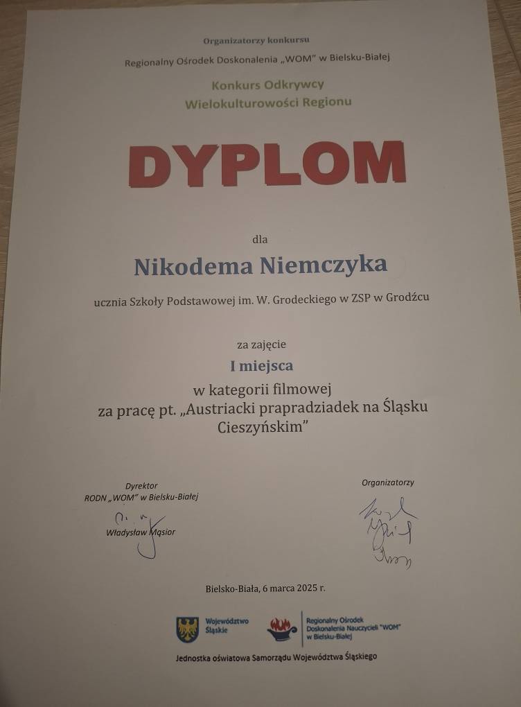 Uczeń ze Szkoły Podstawowej w Grodźcu uzyskał I miejsce w Konkursie Odkrywcy Wielokulturowości Regionu. Dyplom i nagrodę odebrał w dniu 6 marca 2025 roku z rąk dyrektora Regionalnego Ośrodka Doradztwa Metodycznego Władysława Mąsiora w Bielsku-Białej. I miejsce to ogromny sukces dla szkoły w Grodźcu, tym bardziej że w konkursie brali udział uczniowie starszych klas szkół podstawowych i licealiści z Bielska-Białej oraz powiatu a Nikodem był najmłodszym uczestnikiem. Nikodem przygotował pracę konkursową w trudnej kategorii film krótkometrażowy. Inspiracją do jej stworzenia były niezwykłe perypetie członków własnej rodziny w czasie I wojny światowej. Uczeń skorzystał z archiwów rodzinnych, szkolnych i zasobów archiwów państwowych w celu pokazania przeszłości regionu i Grodźca. Sam zadbał o scenariusz, reżyserię, a nawet wcielił się w jedną z postaci. Nikodem Niemczyk interesuje się historią i ma niecodzienną pasję – uwielbia rekonstrukcje historyczne oraz zbiera repliki umundurowania z okresu I i II wojny światowej. Film stał się dla niego okazją do podzielenia się swoją pasją i pokazania cennej prywatnej kolekcji militariów. Wszystko to zostało docenione przez jury konkursowe, które przyznało mu zasłużone I miejsca.